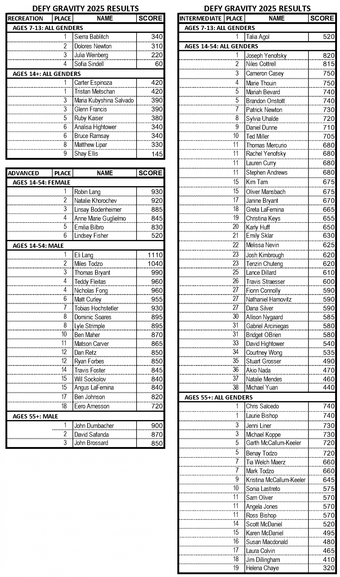 A huge thank-you to everyone who joined us for the 4th Annual Defy Gravity Top Rope Comp! It was incredible watching climbers of all ages tackle 30 brand-new, exciting routes. Whether you were pushing your limits or cheering from the ground, your energy and dedication made this event unforgettable!