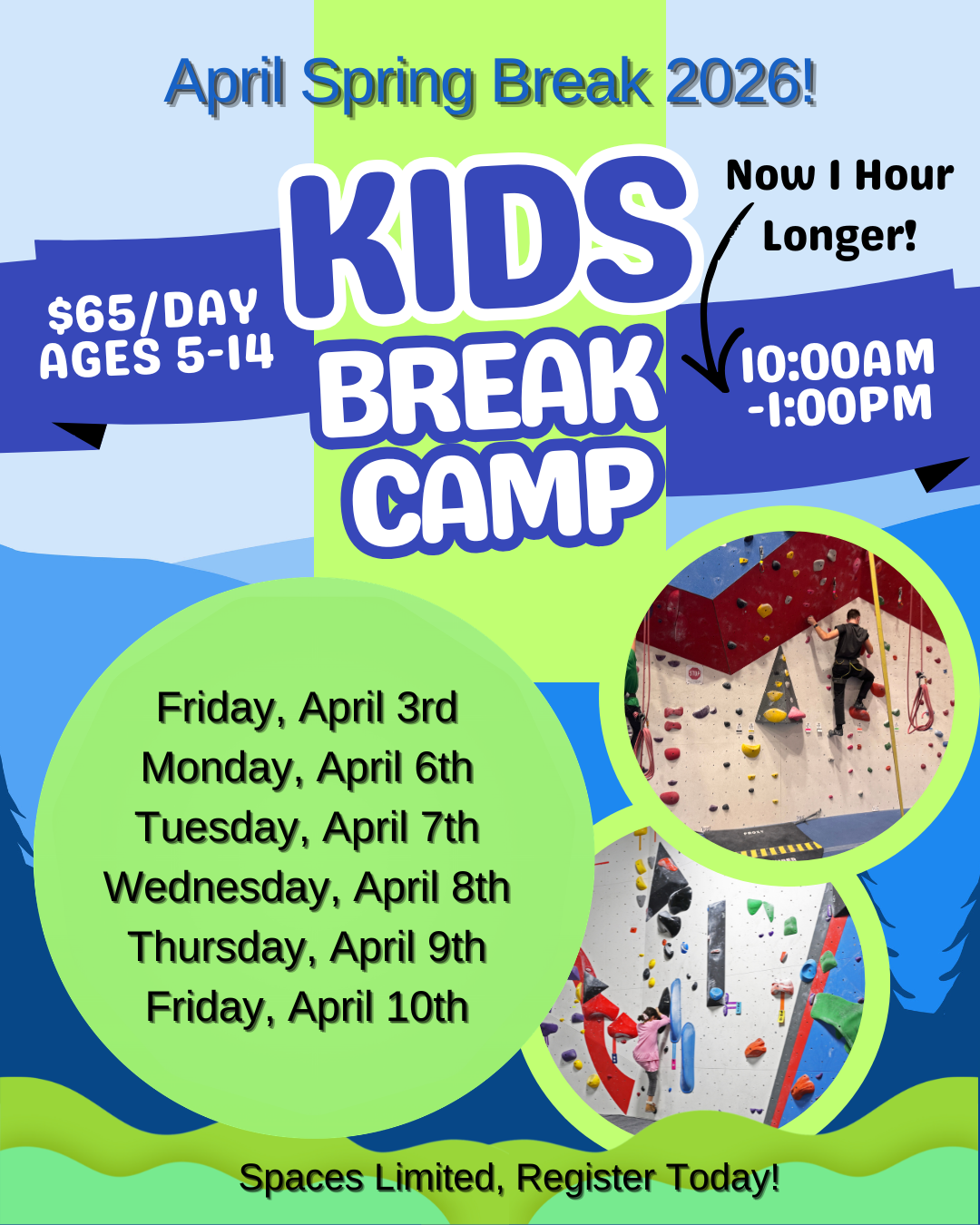 Includes: All necessary equipment and a day pass for climbing after the class