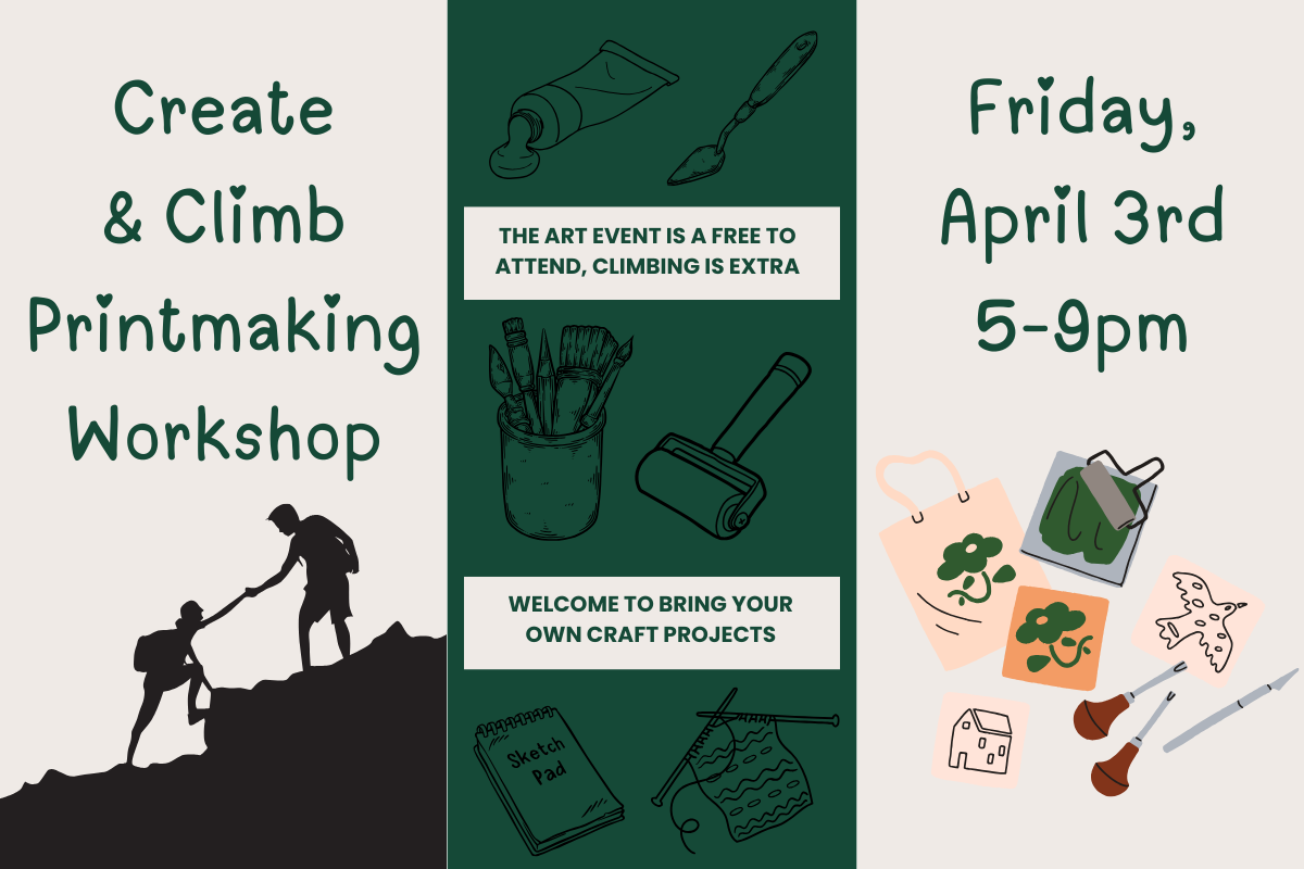 “Create and Climb is a free art making event for our climbing community to come together to create art and send some climbs! A Printmaking workshop along with lots of other crafts like coloring and painting will be provided for our climbers on Friday, April 3rd from 5pm-9pm. All are encouraged to come, create something new and get to know our climbing community!”