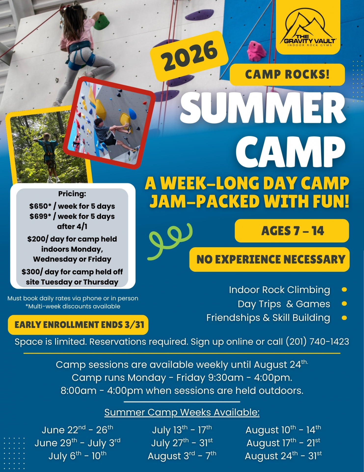 The Gravity Vault reserves the right to cancel a week if enrollment is below 10. If an outdoor climbing day must be canceled due to weather, the day will be spent indoors. There will be no make-ups or refunds if an outdoor day is canceled due to inclement weather.