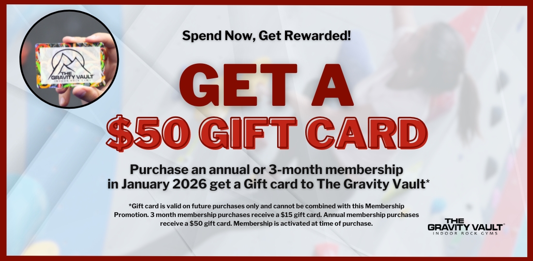 If you are new to climbing and looking for an alternative to the big box gym fitness experience then try out a membership and grab your new gear with the gift card! Or if you've been around the gym a while go ahead and take advantage of this special for some fresh equipment from our retail store or to bring friends in later!