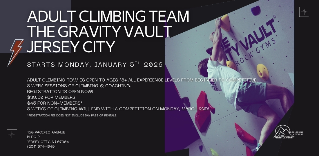 Ready to level up your climbing? Join the Adult Climbing Team at The Gravity Vault – Jersey City starting Monday, January 5th, 2026!