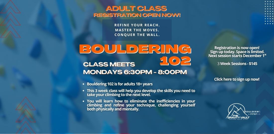 The overall goal of our Bouldering 102 classes is to develop the climbing skills, abilities, and confidence to reach new heights.